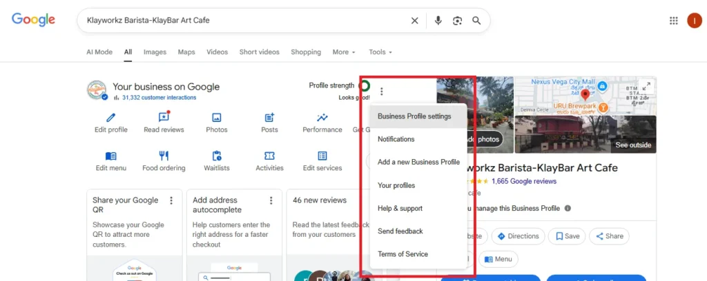 The ellipsis menu (represented by three dots “…”) in Google Business Profile provides quick access to essential tools and settings that help business owners efficiently manage their online presence. When you click the ellipsis in the top-right corner of your profile, you’ll find several useful options including Business Profile Settings, Notifications, Add a New Business Profile, Your Profiles, Help & Support, Send Feedback, and Terms of Service.