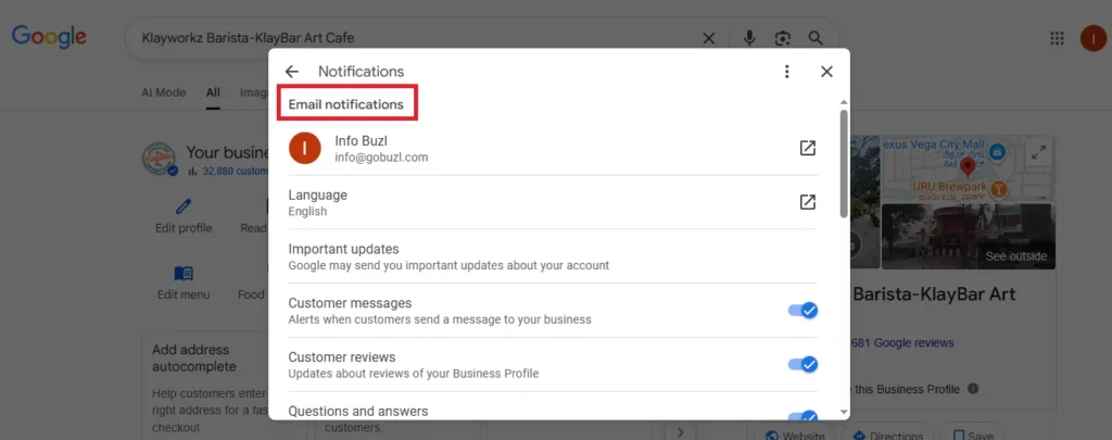 In the Notifications section, you can set up and manage email notifications related to various actions on your Google Business Profile, such as receiving customer messages, reviews, and other important updates.