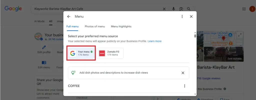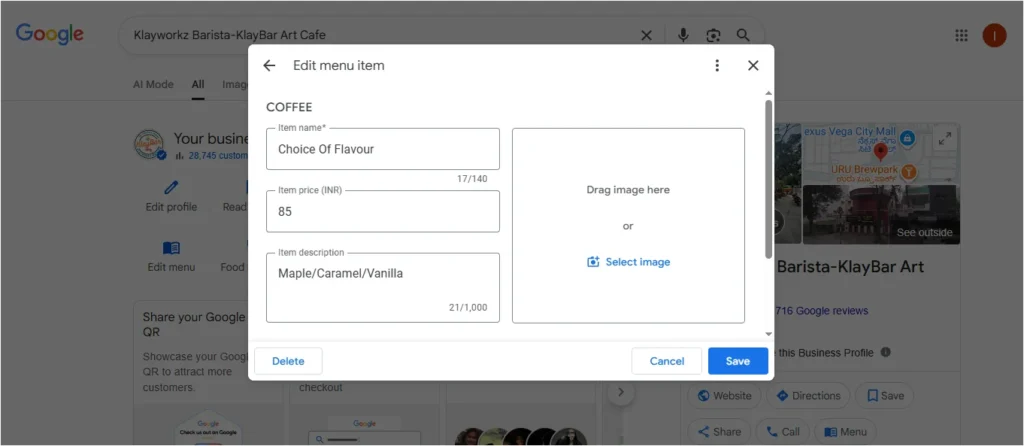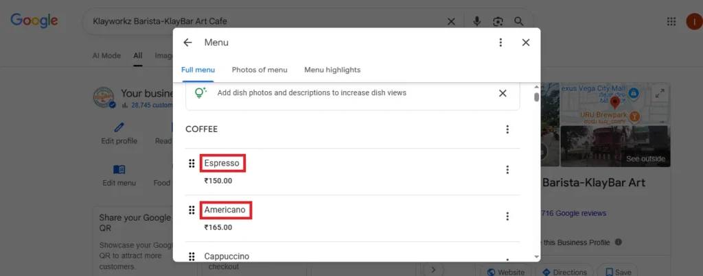 If you own a café and have a Cold Brew Coffee listed at ₹150, but you recently raised the price to ₹180 due to new sourcing costs, it’s important to update the price on your Google Business Profile. Keeping this information current avoids confusion and ensures that potential customers are aware of your pricing.