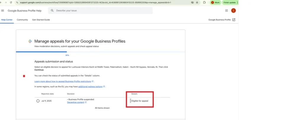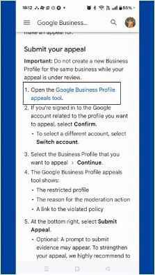 2. Visit the Google Business Profile appeals tool and open the profile you appealed. (support.google.com)